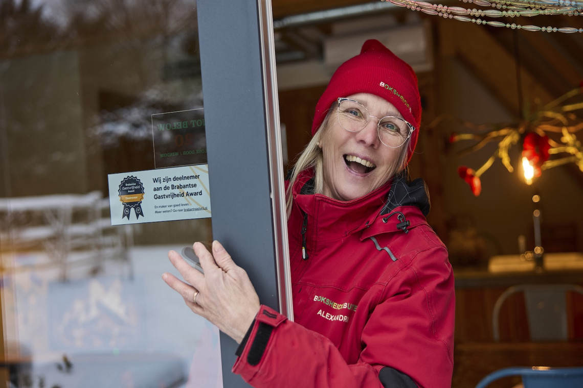Isabella, le photographe Bart Roos et deux bénévoles de Visit Eersel, Pauline et Jos. Je connais Jos pour être passée chez eux plusieurs fois afin de leur remettre des flyers de BoksheideBuiten. Bart est déjà en train de prendre des photos lorsque j’arrive. Pauline et Jos ont apporté des valises à roulettes, comme s’ils venaient séjourner chez nous. Je les accueille comme toujours avec une accolade. Quelle surprise inattendue et géniale! J’ai amené un invité mystère et je demande à Bart de tenir son appareil photo prêt. Notre chienne Vesta, toujours joyeuse, se précipite pour apporter sa contribution mystérieuse et accueillir les invités à sa manière spontanée.